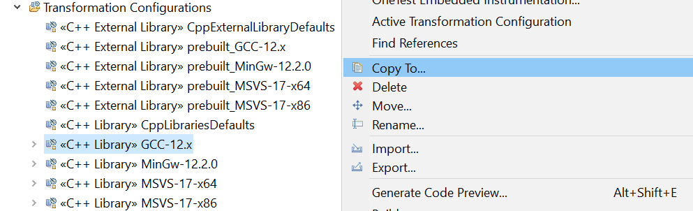 If you take a copy of the Connexis model library (DCS), you can either modify an existing library TC or create a completely new TC for building the library. You can clone an existing TC by means of the context menu command Copy To.