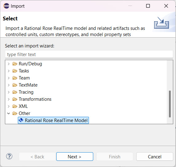 In the Import wizard, expand the Other section and select Rational Rose RealTime Model.