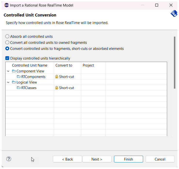 The Import a Rational Rose RealTime model wizard has several pages that provide options on how to import the model into DevOps Model RealTime. The most significant is the "Controlled Unit Conversion" page, which allows you to select how the different controlled units in the RoseRT model are migrated into Model RealTime. A "Controlled Unit" is a separate file that stores a particular model element at its root. Controlled units allow you to edit elements such as packages and classes independently of other elements in the source control system. The corresponding terminology in Model RealTime is called a "fragment", which is essentially the same thing as a controlled unit.