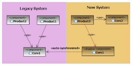 In this example, the component Core1 is used by Product1 and Product2 in RoseRT. However, Product3 has migrated to Model RealTime and also depends on Core1. Core1 has been imported as a shadow package and replicates or synchronizes with Core1 in RoseRT.