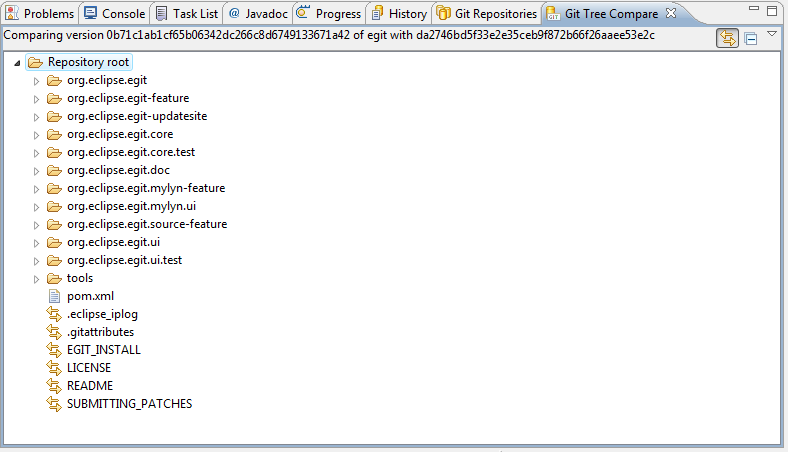 The Git Tree Compare View can also be started without having workspace resources as starting point (for example by comparing two commits in the history view when the input of the history view is a Repository and not a workspace resource). In this case, the complete content of the Repository is shown and both projects and folders appear as simple "folder" icons: