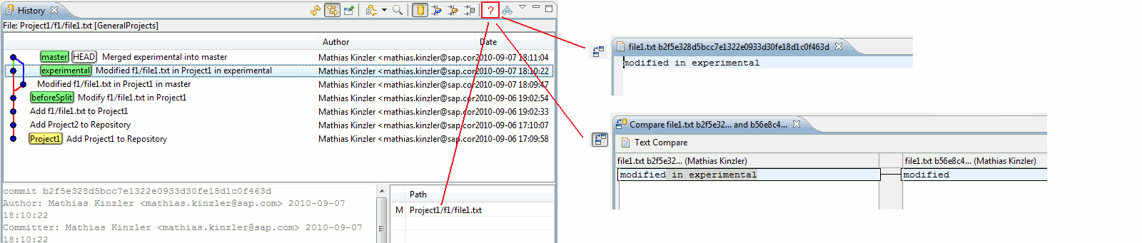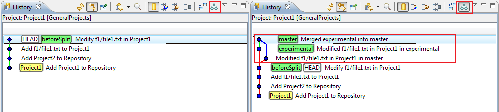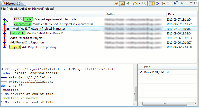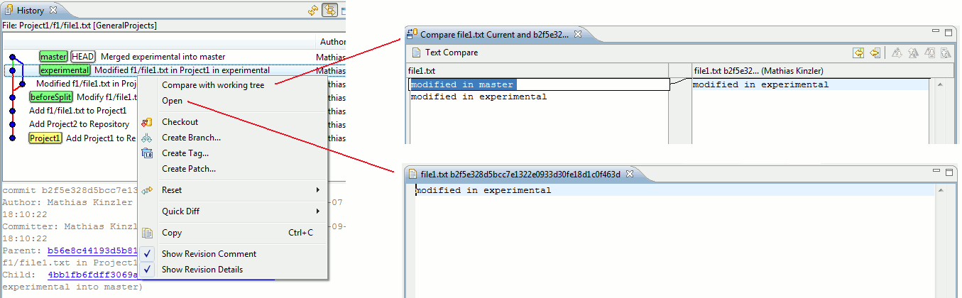 The exact change can be inspected by marking a commit and looking at the Revision Comment area. When scrolling down in the Revision Comment area, a textual diff for the changes will be visible, in our example it says that the content of Project1/f1/file1.txt was changed from "modified" to "modified in master". When selecting the next commit (which corresponds to the "experimental" branch), a similar diff would be displayed, saying that the content of that file was changed from "modified" to "modified in experimental". The newest commit is the result of merging "experimental" into "master". Accordingly, the new commit has two ancestors and the "master" and "experimental" lines are joined again.