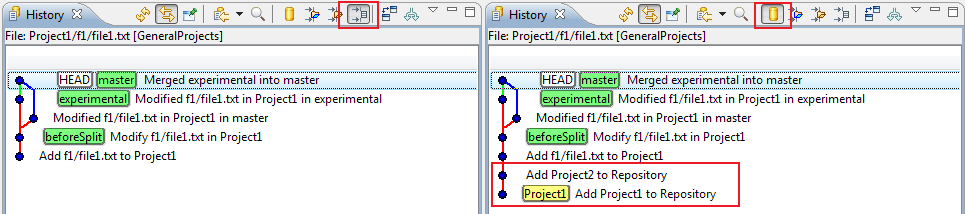 The behavior of the other two settings ("Folder" and "Project") is similar in that they include the commits that change any resource in the parent folder of the current input or any resource in the project of the current input, respectively. In our example above, if filter setting "Project" would be used, the commit "Add Project2 to Repository" would not be shown, is it doesn't change anything in the project of the current input (Project1/f1/file1.txt).