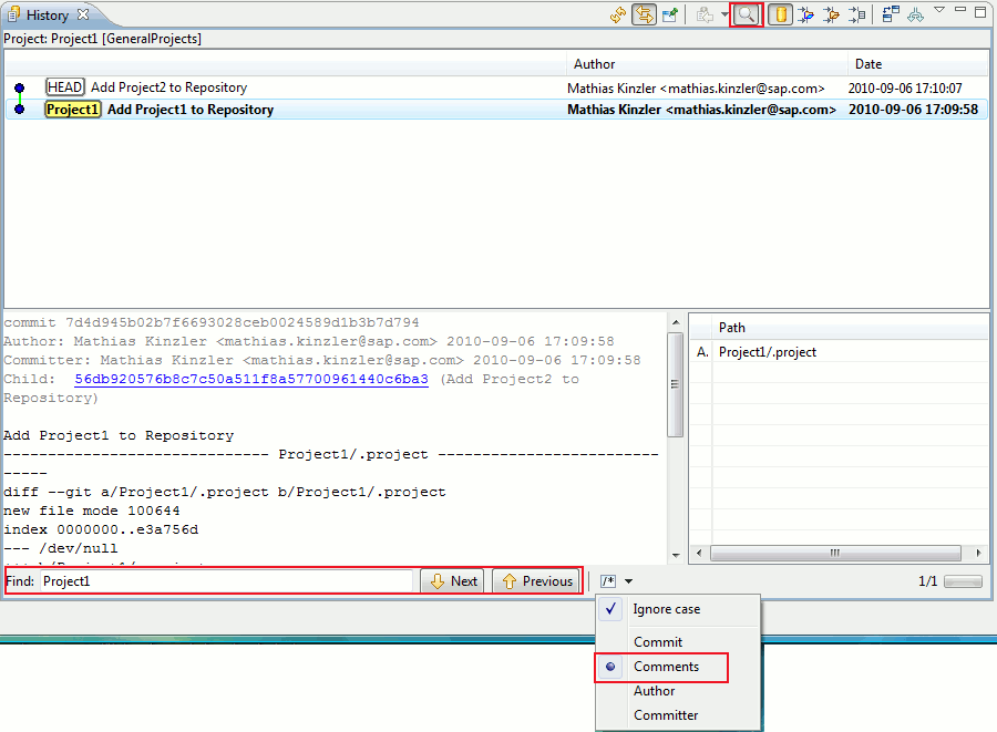 If the "Find" toolbar button is down, a search bar is displayed in the lower part of the view which allows to search for commits in the commit log. Depending on the setting in the drop-down list in the search bar the commit's title, comment, author or committer are searched.