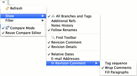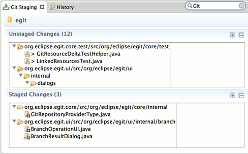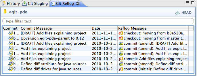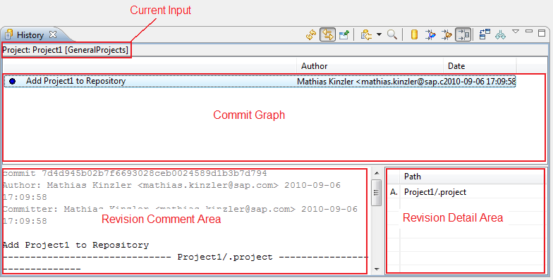 The History View for Resources under Git version control is a commit-centric view of the resources in a given Repository. It can be used to perform the following tasks: