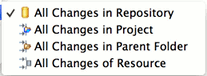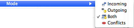The Synchronize View can be filtered using modes using either the toolbar actions or the menu items in the view's drop down menu. Modes can be used to show only incoming, outgoing or conflicting changes.