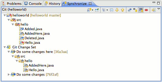 The Synchronize View shows the synchronization state of resources in your workspace or a local branch compared to those in another local or remote tracking branch representing the state of a branch from a remote repository. This state is shown by using icons and can also be configured to show the state as text appended to the resource name.