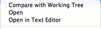 The Open and Compare with working tree actions can also be executed by double-clicking on a commit: if the "Compare Mode" toolbar button (see below) is down, Compare with working tree will be executed, otherwise Open.
