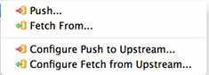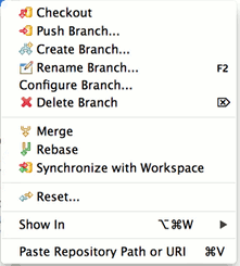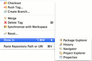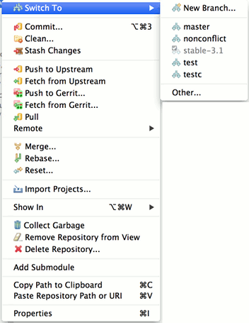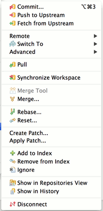 On project nodes in navigation views (Navigator, Package Explorer etc.) the following Git actions are available for projects shared with the Git team provider: