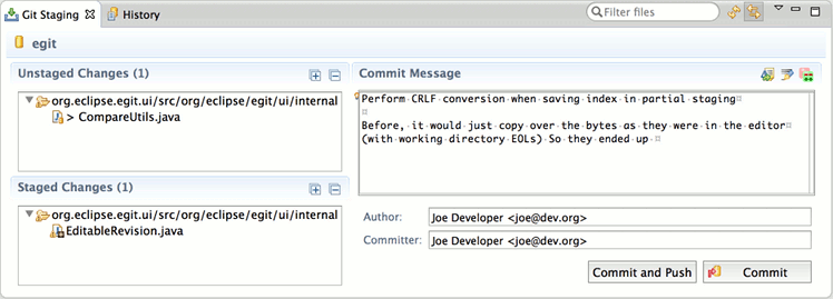 The commit action will commit the staged changes only -- similar to what git commit does in native git. An integrated commit message editor allows to edit the commit message for the commit. In contrast to the commit dialog, the staging view can be kept open while doing changes. This allows for incrementally writing the commit message along with the changes. The commit message being edited is associated with the repository, the staging view is linked with. It is not stored persistently and will get lost if the staging view or Eclipse are closed.